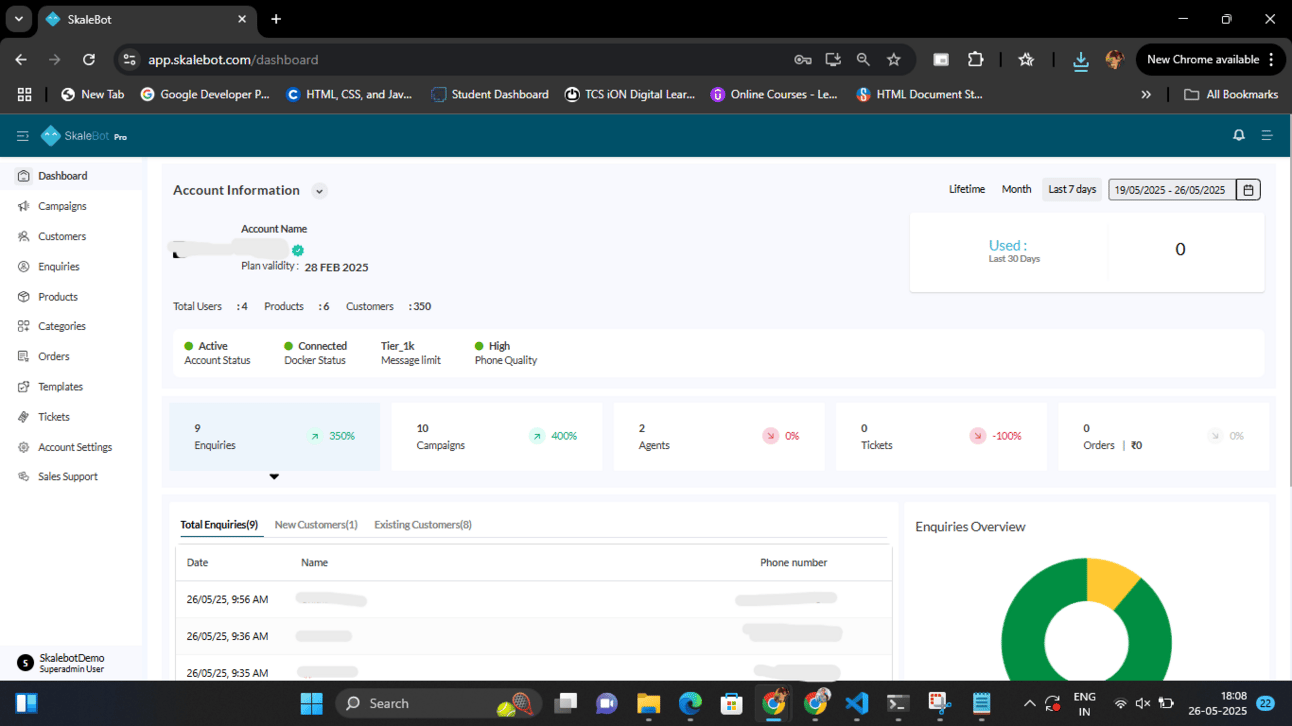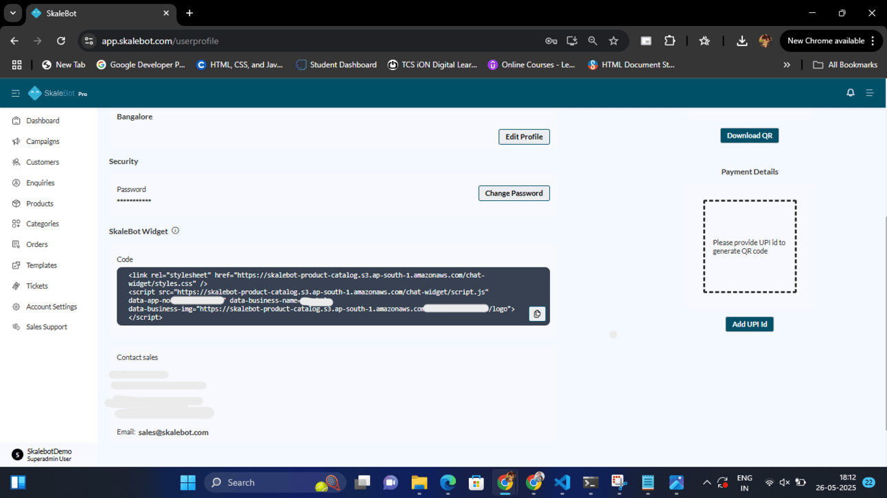 🖼️ Step 1: Go to Your Skalebot Dashboard Log in to your account and head over to the “Chat Widget” section under your business profile.